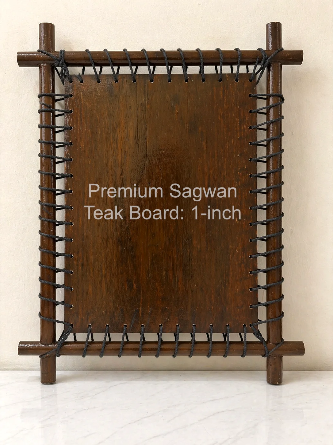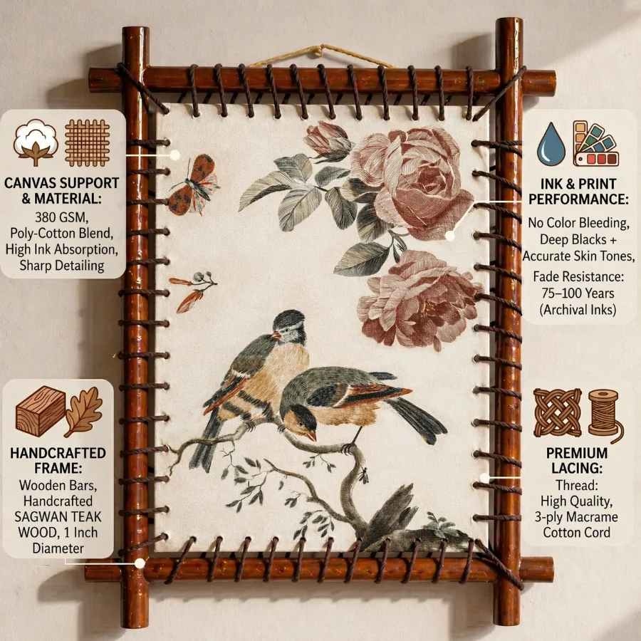 Presented as a floating canvas installation, the artwork is tension-mounted on solid Sagwan teak, creating a clean, modern form designed for contemporary walls.