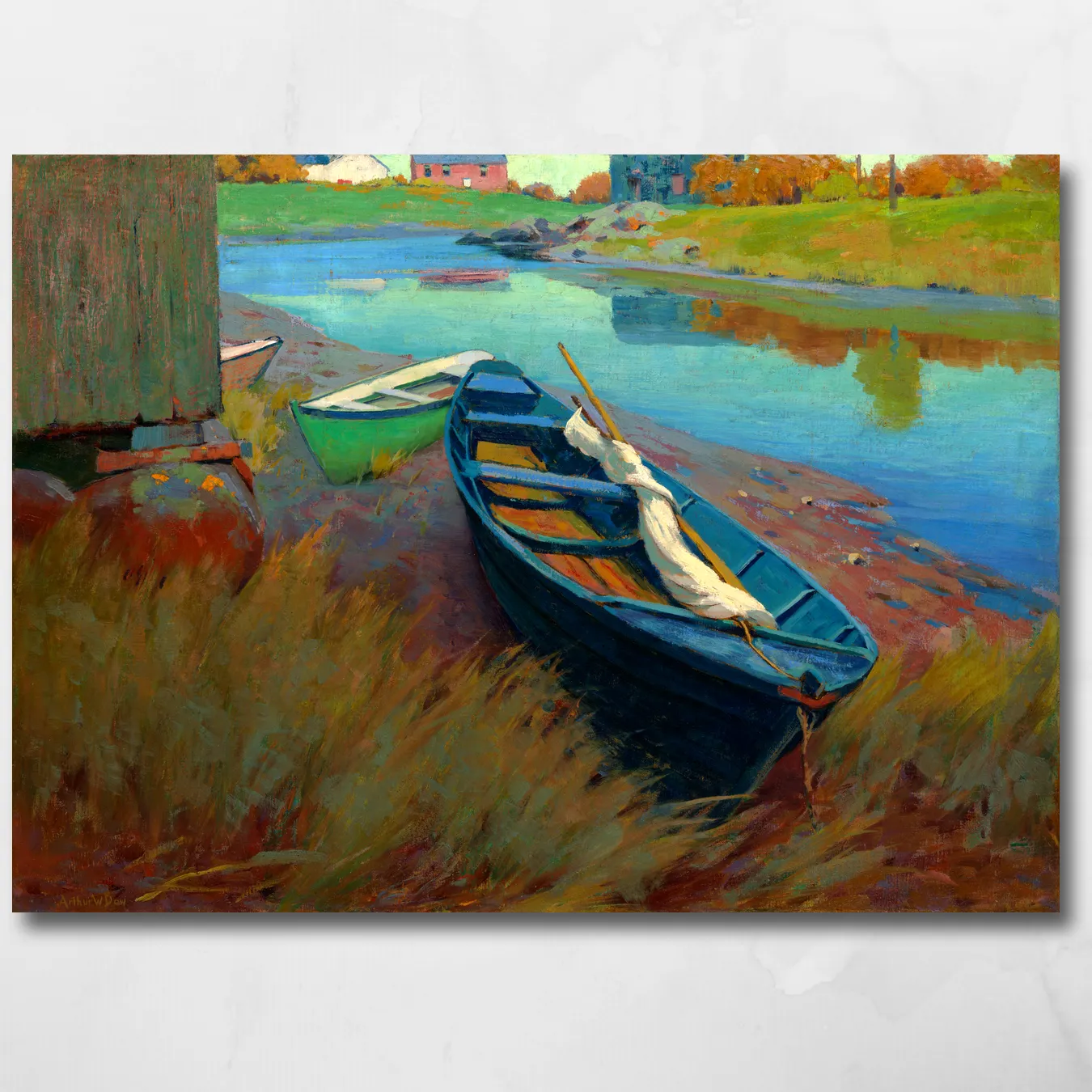 Arthur Wesley Dow was one of the most influential art teachers America ever produced — Georgia O’Keeffe was among his students — and yet his own paintings remain quietly, stubbornly overlooked. He spent years studying Japanese woodblock prints until he understood not just how they looked, but why they worked: the cropping, the elevated perspective, the way flat colour could carry more emotional weight than all the shading in the world. Then he walked out to the marshes of his native Massachusetts and applied everything he’d learned to the world right in front of him. The result sits between East and West, between seeing and feeling, in a way that still feels completely unclassifiable. On large-format museum-grade canvas, that colour — that impossible blue against rust and amber — fills a room with a stillness that takes a moment to understand and stays with you long after.