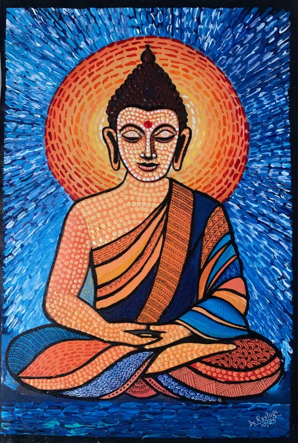 The tranquil Buddha, painted in vibrant hues of blue and saffron, symbolizes harmony between stillness and cosmic motion.