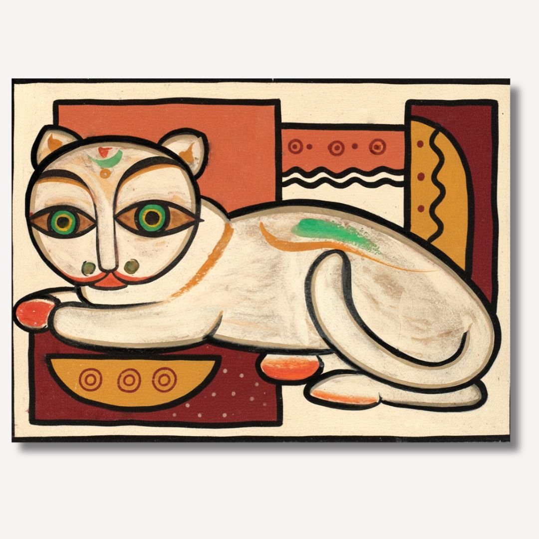 Experience the charm of Jamini Roy’s iconic cat, a timeless symbol of Indian modern art. Roy transforms a simple subject into a powerful visual through bold lines, flat tones, and rhythmic folk expression. His distinct Bengal-inspired style bridges tradition and modernism with effortless grace.