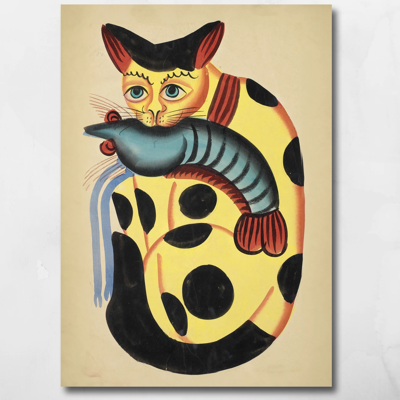 Jamini Roy did something radical: he turned his back on European academic training and looked instead at the folk painters outside Kolkata’s Kalighat temple. The cat clutching a prawn became one of his most repeated images — bold, flat, completely unafraid. Roy painted it again and again, like a jazz musician returning to a favourite riff, each version slightly different but always unmistakably his. On a large BAC canvas, this brings warmth, wit, and a distinctly Bengali soul into any room.