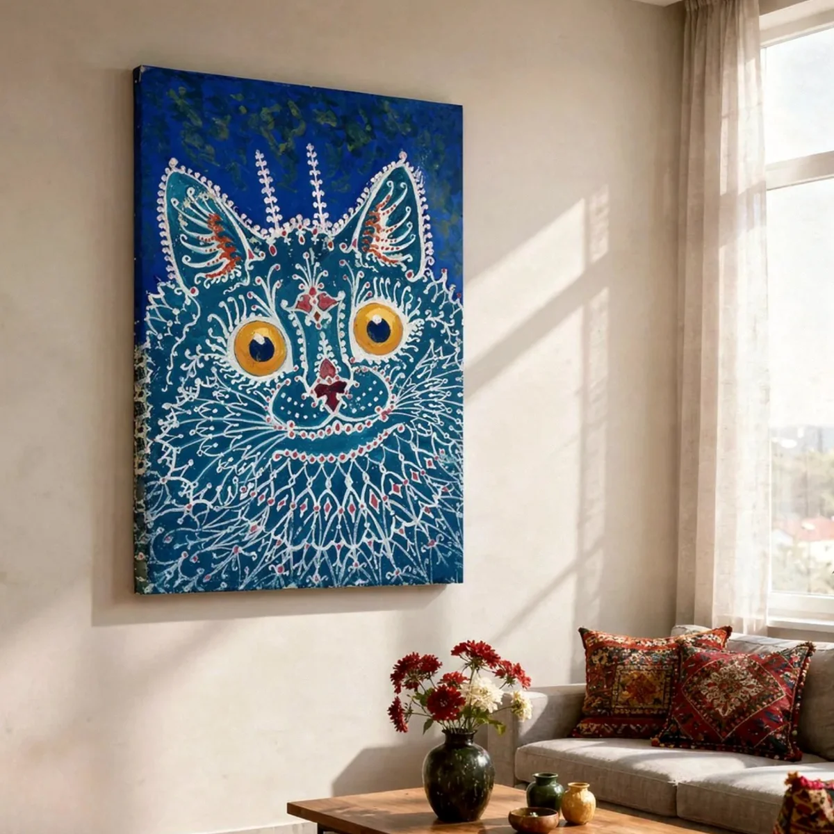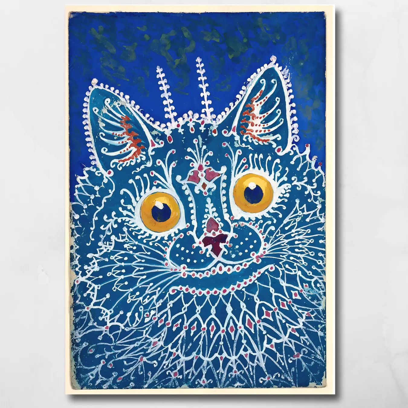 There is a category of art that doesn’t decorate a room so much as haunt it — affectionately, electrically, with those gold eyes following you from across the space and absolutely refusing to look away. This cat exists somewhere between folk art, psychedelia, and pure pattern obsession: the lace-like white lines spreading across deep blue like frost on a window, the jewel-red accents placed with the precision of someone who knows exactly what they’re doing. Sourced through the BAC Artist Network — artists working at the intersection of classical pattern traditions and contemporary vision. On large-format museum-grade canvas, those eyes are approximately the size of small suns. You have been warned.