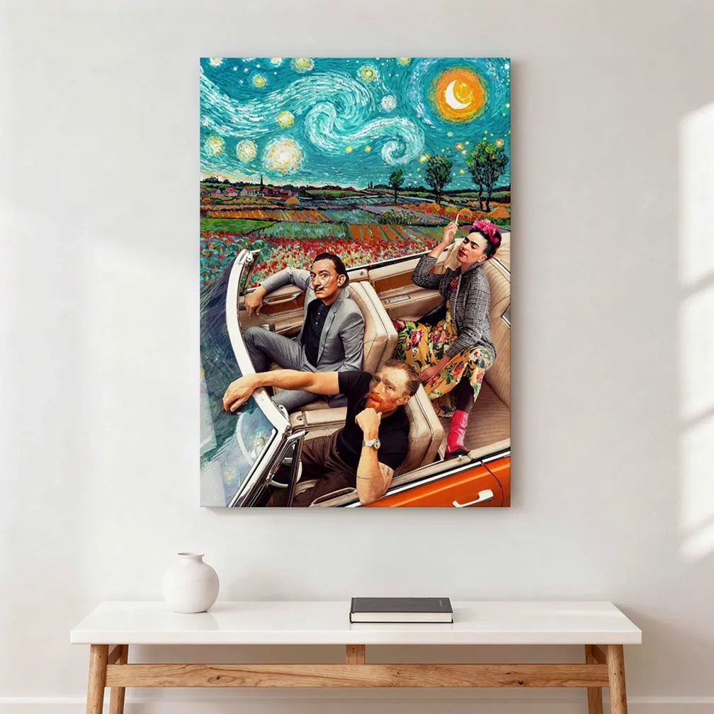 DalĂ would have planned the route. Van Gogh would have ignored it. Frida would have redrawn it entirely and made it better. Three artists who broke every rule their era handed them — together in a convertible, under a Starry Night sky, going somewhere the art world wasn’t ready for. This one’s for the wall that wants a conversation starter, not a conversation ender. High resolution museum-grade canvas, because even the jokes deserve to be taken seriously.