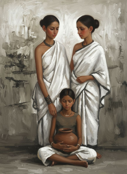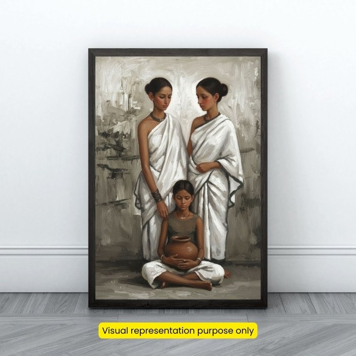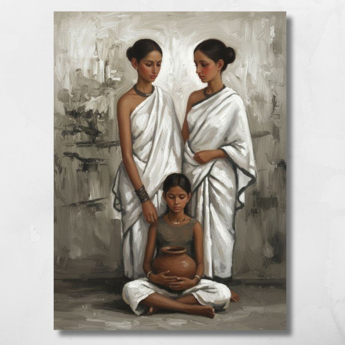 This captivating digital artwork draws inspiration from Indian modernist traditions, reimagined with a contemporary aesthetic that retains emotional depth and quiet strength. The three women, dressed in flowing white drapes, embody grace, resilience, and inner stillness, set against an abstract rustic backdrop.