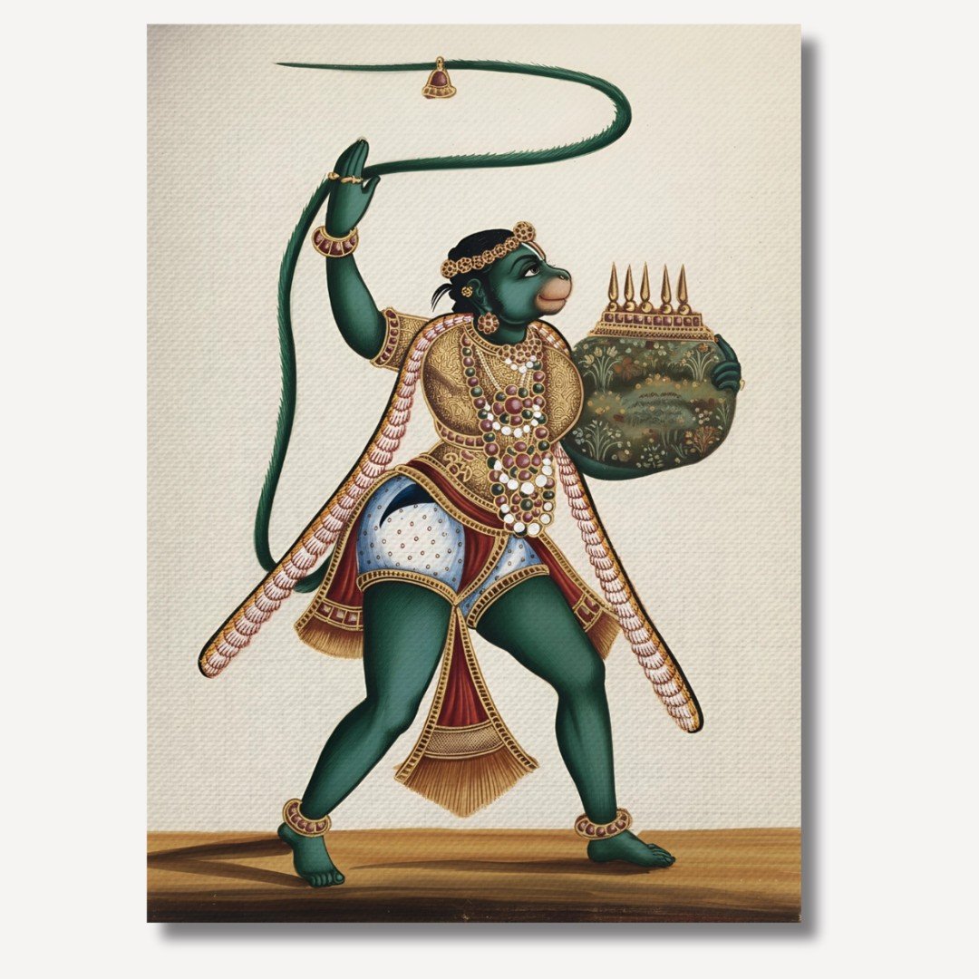 We recreated Hanuman Carrying Mount Dronagiri as a modern reinterpretation of the original painting. Inspired by its timeless symbolism of devotion and strength, we reworked the scene with contemporary colors, refined detailing, and a design sensibility that speaks to today’s spaces.