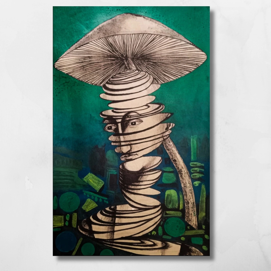 In Head and Mushroom, Bhimrao Vishvanath Dhaware extends his exploration of the human psyche with quiet symbolism. The work, rendered in his signature monochrome style, merges the fragility of a human head with a mushroom — a dialogue between thought and nature, structure and emotion.