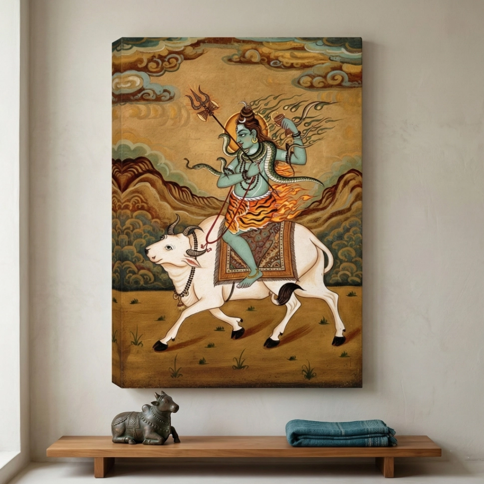 Shiva is the most paradoxical of the gods — the destroyer who makes creation possible, the ascetic who married the most beautiful woman in the cosmos, the stillest being in existence riding with fire in his wake. Studio BAC didn’t soften any of that. The tiger skin burns, the serpents coil with quiet menace, the trishul cuts the sky — and through all of it, Nandi moves with the steady devotion of someone who has never once doubted where he is going.