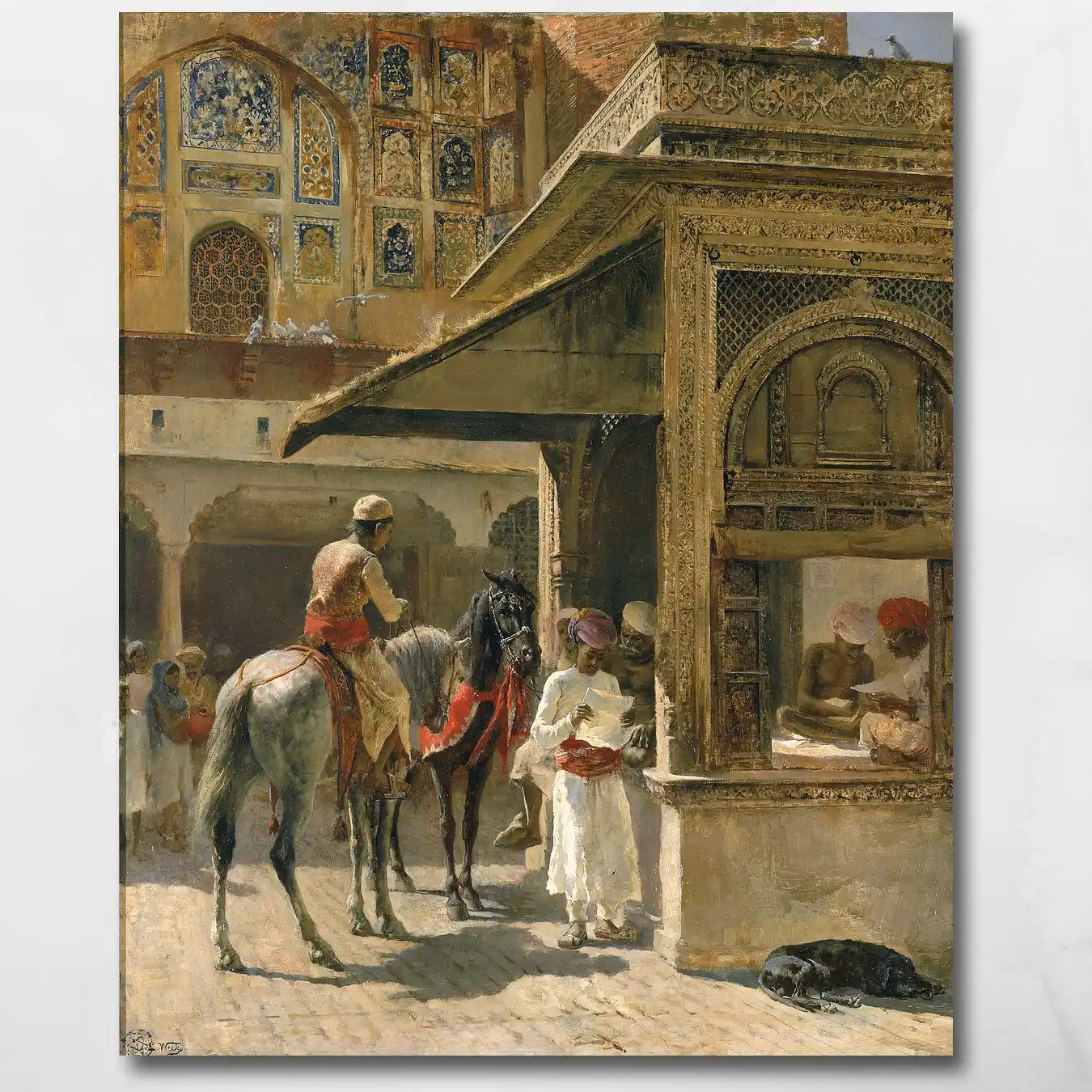 Edwin Lord Weeks came to India not once but repeatedly, drawn back by something he couldn’t find anywhere else — a quality of light, a density of life, an architecture that treated ornament as philosophy rather than decoration. He was rigorous about it: sketchbooks full of studies, a painter’s eye that refused to simplify what it saw. This street hasn’t been tidied for the canvas. The dog sleeps where it wants. The transaction at the shop window is unhurried. The horses stand with the casual authority of animals that belong exactly where they are. Weeks painted India as a place with its own complete logic — not exotic backdrop, but living city. On large-format museum-grade canvas, the carved stonework and afternoon light that he documented with such devotion finally get the scale this architecture always deserved.