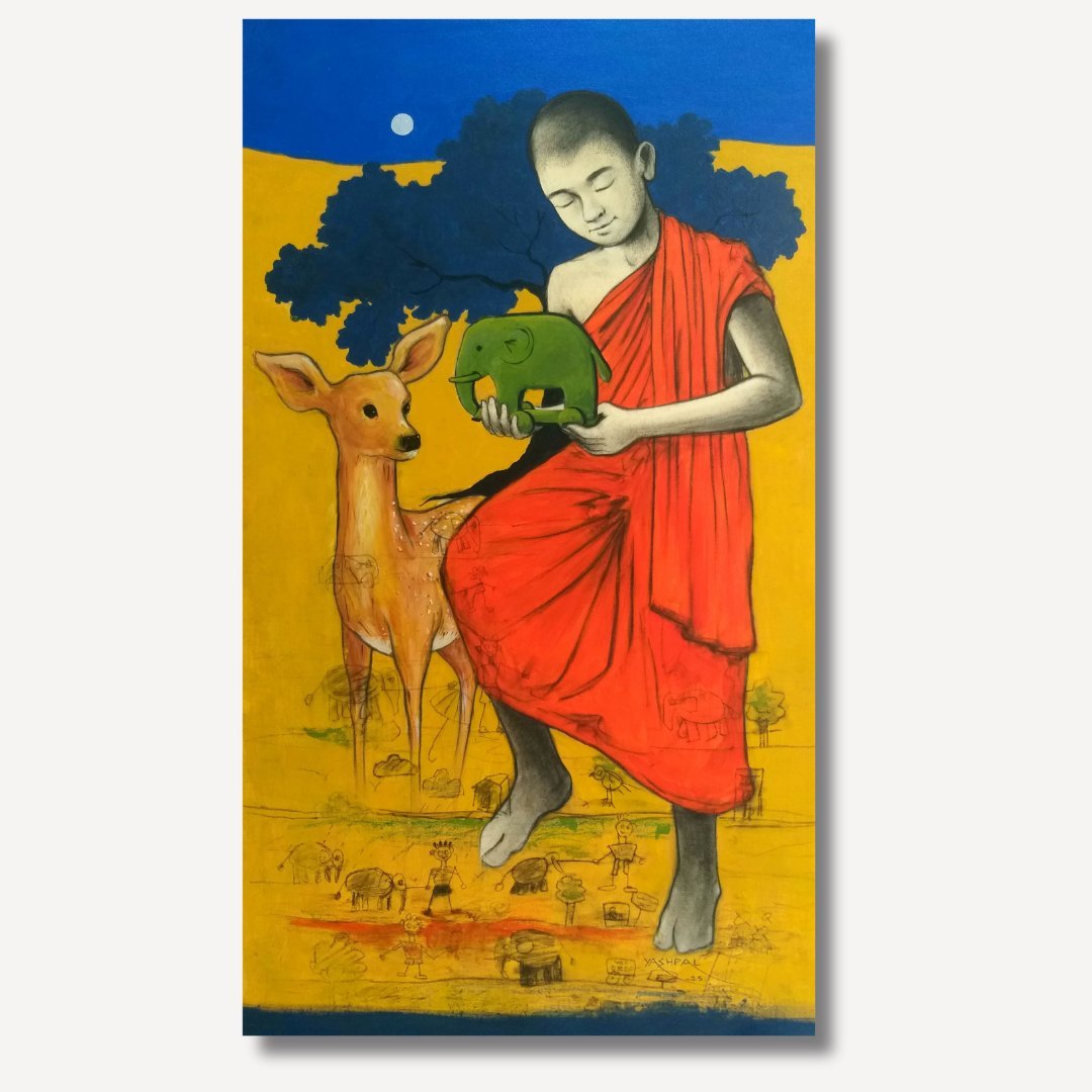 Yashpal Kamble, a graduate of the J.J. School of Art, is a distinguished mixed media artist whose work reflects quiet emotion and spiritual depth. In his painting “Innocent Joy,” he portrays a Buddhist boy with a toy elephant and deer, rendered with layered textures and gentle tones that evoke purity, tenderness, and balance. The composition carries a sense of stillness — a moment of childlike wonder expressed through a mature artistic vision.