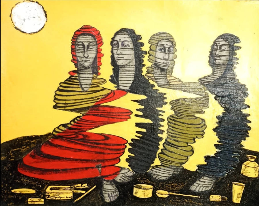 Rooted in his deep connection to Latur, the artist transforms collective trauma into contemporary expressionism. Each contour speaks of displacement and survival, reflecting Dhaware’s fascination with human emotion and social narrative. The moon above serves as a quiet witness, illuminating a moment suspended between remembrance and rebirth.