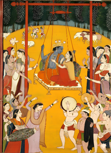 This artwork revives a vintage painting of Radha and Krishna on a wing with celebrations around them. We enhance the original with care, renewing its color and detail while preserving its grace and intimacy. The piece captures the eternal love of the divine couple — pure, balanced, and deeply human.