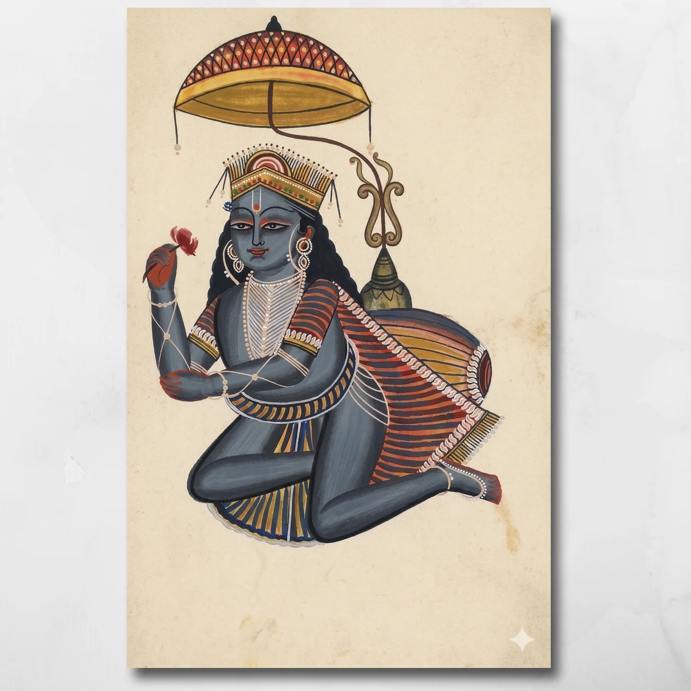 The Kalighat patua painters had no interest in reverence for its own sake. They painted the gods the way they painted everything else — with a bold line, a flat field of colour, and the complete confidence of artists who answered to no academy and no patron class. This Krishna doesn’t invite worship from a distance. He sits with the relaxed authority of someone entirely comfortable in his own divinity — the lotus held lightly, the gaze level, the striped shawl as vivid as a market cloth. That directness is the whole Kalighat philosophy: the sacred made immediate, the divine made present, no gilded frame required. On large-format museum-grade canvas, the line work that defines this tradition hits with a graphic force that feels as contemporary as it does ancient — because great visual language doesn’t age.