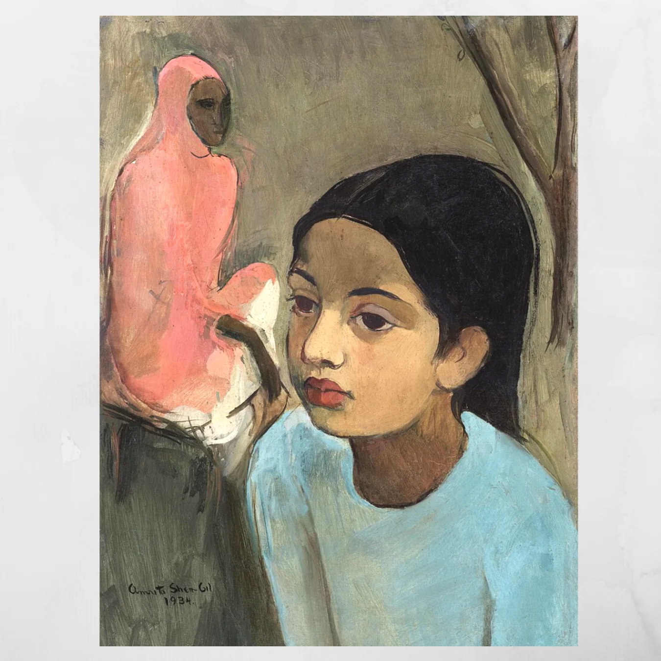 Amrita Sher-Gil came back to India from Paris already celebrated, already dangerous, and with a mission she could never quite put into words but never stopped pursuing: to paint Indian women as they actually were — not goddesses, not decorations, not ideals — but people with an inner life that the world hadn’t bothered to ask about. She died at 28, which makes every canvas she left behind feel like both a beginning and an end. This girl’s gaze holds something unresolved — a thought mid-sentence, a feeling that hasn’t found its name yet. Sher-Gil didn’t paint faces. She painted interiority. On large-format museum-grade canvas, that quiet intensity becomes impossible to walk past without stopping.