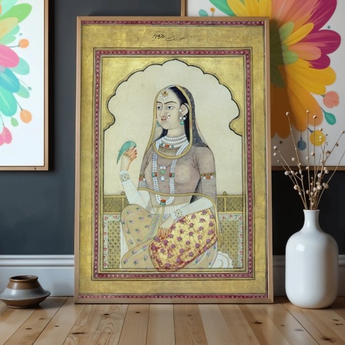 Discover the allure of a Mughal era painting featuring a poised woman tenderly holding a parrot. Crafted with intricate details, this artwork captures the opulence and artistry of a bygone epoch. Owning such Mughal art at home is a statement of refined taste, bridging the gap between historic grandeur and modern aesthetics.