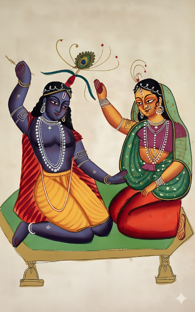 Experience the divine love of Radha and Krishna through our meticulously enhanced and crafted Kalighat painting. Each brushstroke embodies the profound emotions and timeless tales of these iconic deities. Choosing this painting not only brings a slice of India’s rich cultural tapestry to your space but also infuses it with an aura of eternal love and devotion. Re produced on high-quality paper and canvas, it promises lasting vibrancy and impeccable detail. Furthermore, with a range of size options available, you can find the perfect fit for any room. Elevate your interiors and let Radha and Krishna’s story resonate within your sanctuary