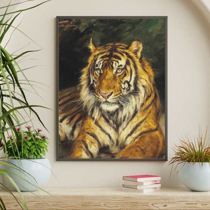 This captivating painting of a beautiful and majestic tiger reclining in a relaxed pose is the perfect addition to any wild life enthusiasts collection. Expertly painted with high detailing, the painting captures the powerful grace of this noble animal. The vibrant colors and lifelike texture of the fur make this painting a stunning piece that will add beauty and elegance to any room. Whether it’s displayed in a living room, bedroom, or office, this Reclining Tiger painting will be a must-have conversation starter.