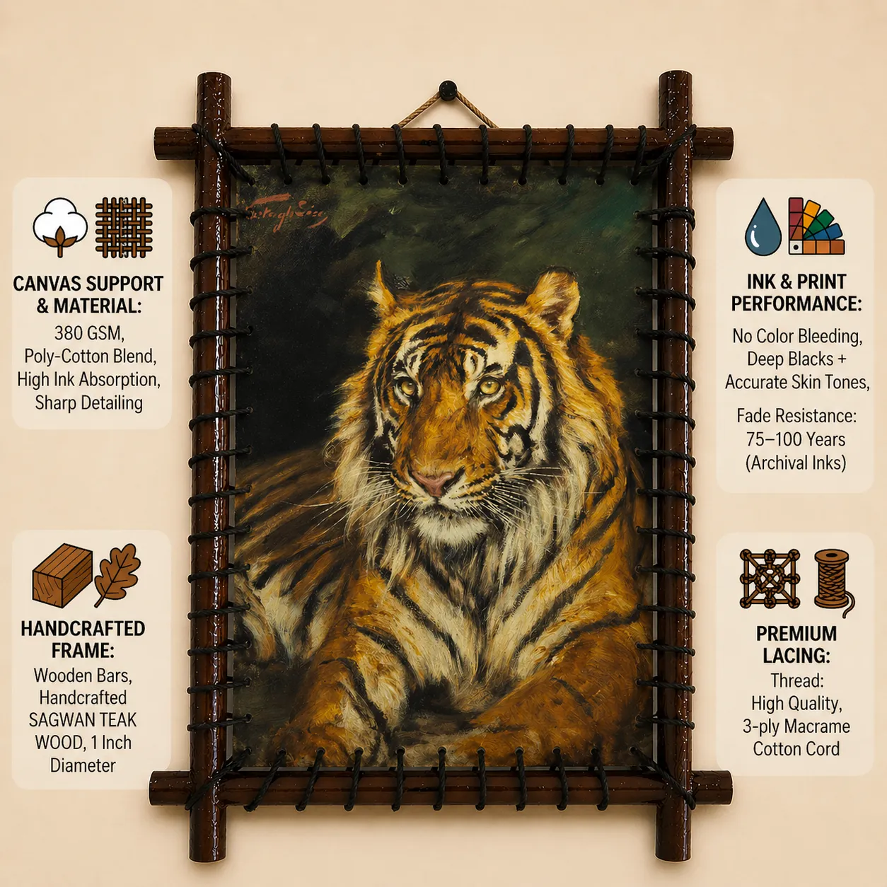 Presented as a BAC canvas installation, the artwork is tension-mounted on solid Sagwan teak. No glass. No outer frame — just a clean, handcrafted structure designed for contemporary spaces.