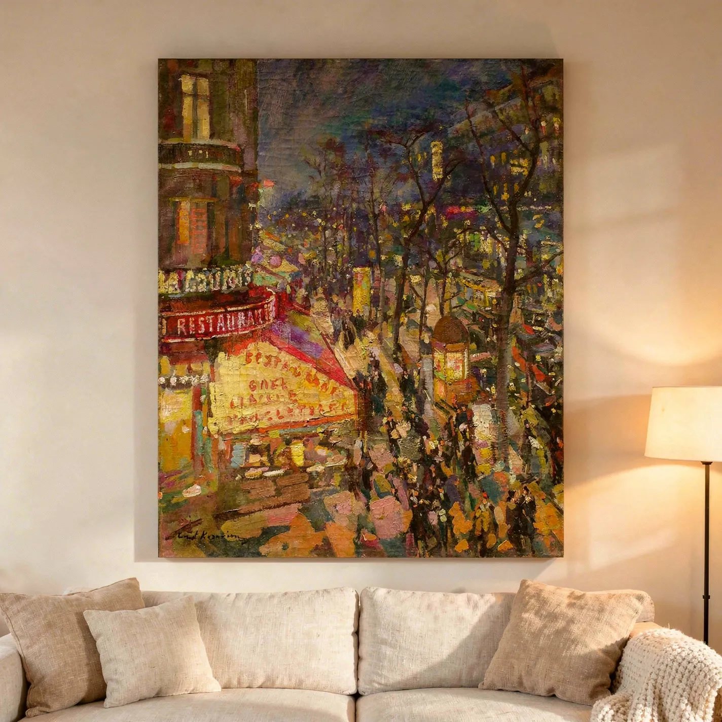 Korovin painted joy the way other artists paint suffering: with total commitment and no apology. He was drawn obsessively to nights like this one — the moment when artificial light takes over from the sun and a city becomes a completely different kind of animal, warmer and more alive and slightly dangerous in the best way. There’s a feeling most people recognise immediately in this painting: being inside the crowd, inside the light, inside the noise, and feeling — just for that hour — that everything is exactly as it should be. On large-format museum-grade canvas, the brushwork crackles with that electricity and refuses to let it go.