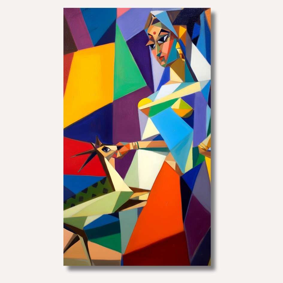 This artwork enhances and recolours a rare vintage piece by legendary artist Angela Trindade, reintroducing her geometric vision of Shakuntala and the Deer. The composition blends symmetry and form with subtle emotion, capturing the calm balance between nature and human presence.