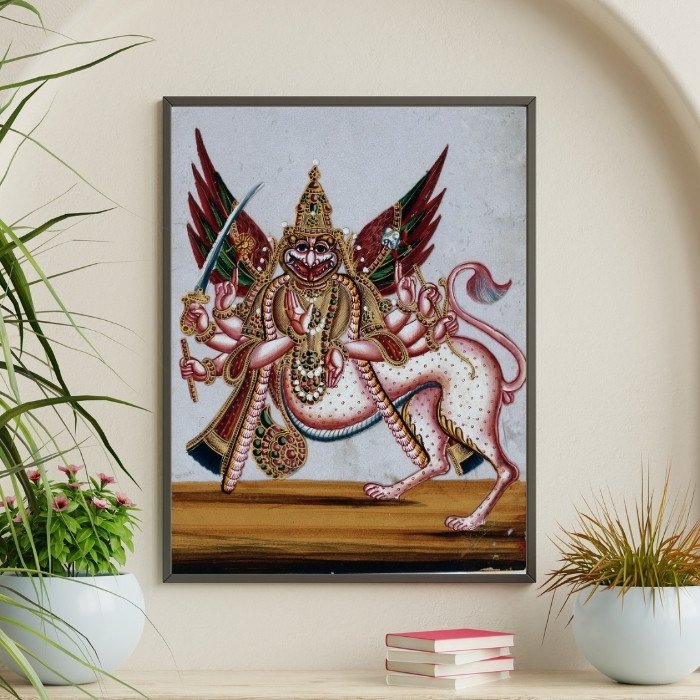 This stunning artwork captures Sharabha’s raw power – a fusion of a lion’s head and a bird’s body, symbolizing the balance between ferocity and spiritual harmony.