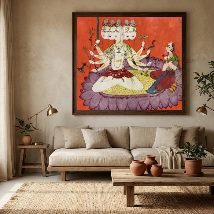 Sadashiva, a shiva painting, embodies the profound essence of creation, preservation, and destruction within Hindu philosophy.