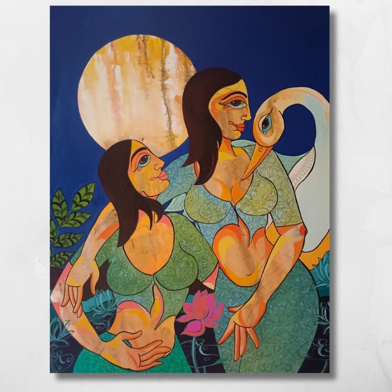 The two women in the painting are depicted in a tender moment, surrounded by natural elements such as the swan, lotus flower, and foliage. The swan, often a symbol of serenity and beauty, is nestled between the women, emphasizing the connection between humans and the natural world. The lotus flower, a symbol of spiritual growth and enlightenment, adds another layer of depth to the painting.