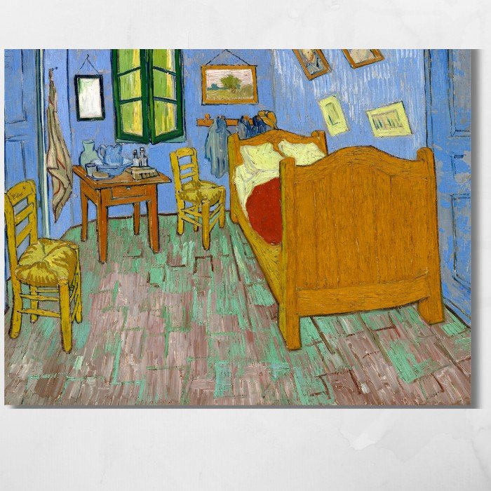 Completely exhausted from the effort, he spent two-and-a-half days in bed and was then inspired to create a painting of his bedroom. As he wrote to his brother Theo, “It amused me enormously doing this bare interior. With a simplicity à la Seurat. In flat tints, but coarsely brushed in full impasto, the walls pale lilac, the floor in a broken and faded red, the chairs and the bed chrome yellow, the pillows and the sheet very pale lemon green, the bedspread blood-red, the dressing-table orange, the washbasin blue, the window green.