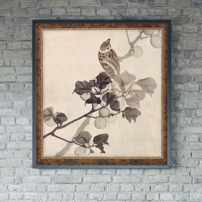 Immerse your home in natural tranquillity with this calming painting of sparrows in a tree. Featuring muted earth tones of soft brown, warm beige, and a dash of black, this minimalist piece evokes the gentle essence of the outdoors. The sparrows, painted in simplistic colors, almost blend into the branches and leaves as they roost among rustling leaves.
