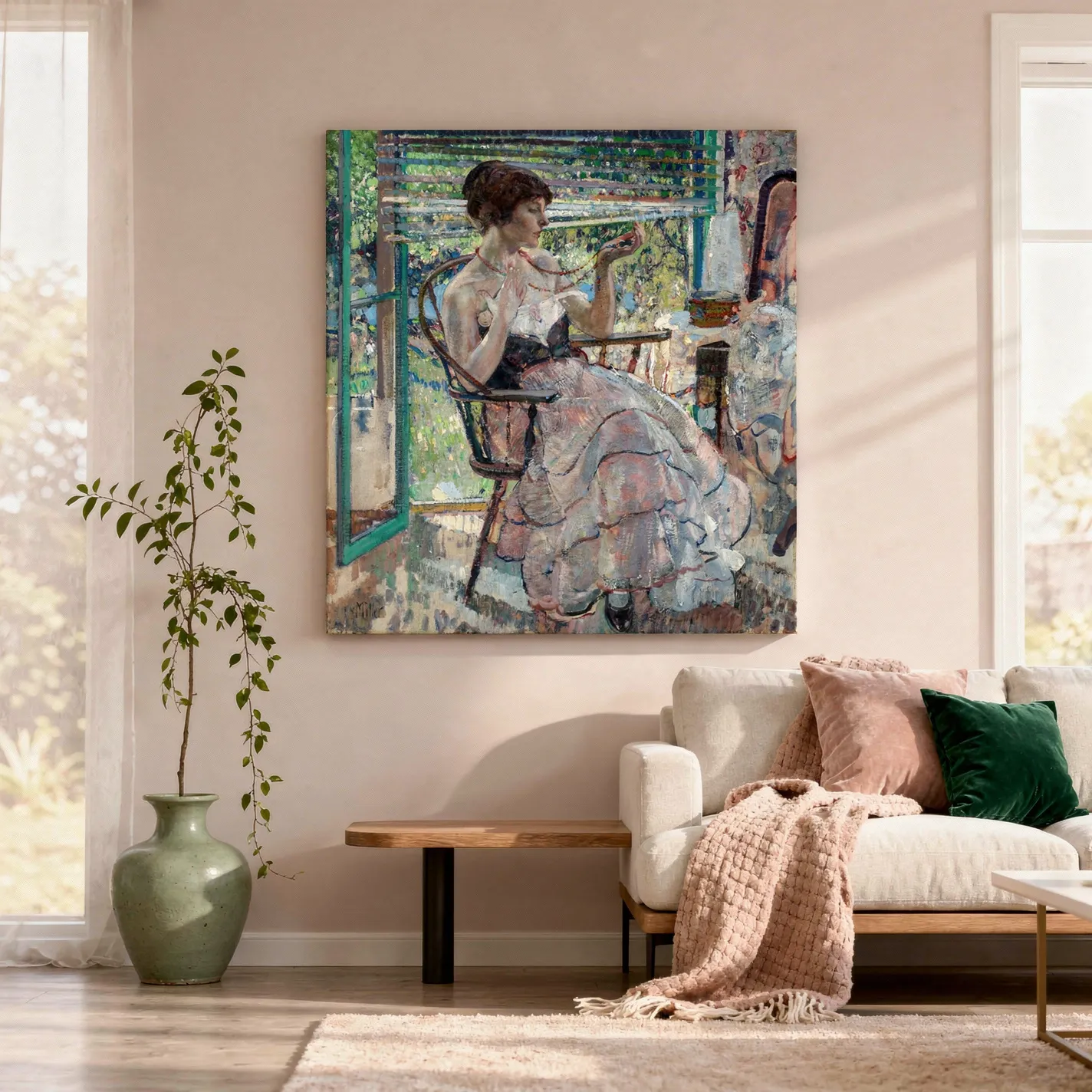 Miller spent years in Giverny, painting in the orbit of Monet, absorbing light the way other people absorb language — until it became the only thing he knew how to speak. His women in interiors aren’t posed. They’re caught in the private moments that happen when no one is supposed to be watching: reading, dressing, thinking, fastening a necklace. That last gesture — small, habitual, entirely personal — is the whole painting. Not a portrait of a woman. A portrait of a moment that belongs only to her. On large-format museum-grade canvas, Miller’s broken colour and interior glow do what they were always meant to do: make the light feel like it’s still moving.