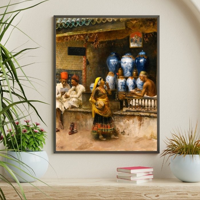 The Perfume Shop stands as more than a painting; it’s an homage to India’s enduring grace. Each carefully rendered element—from the expressive figures to their nuanced gestures—honors both heritage and beauty, making this an exceptional choice for collectors who appreciate narrative depth, atmospheric beauty, and masterful detail.