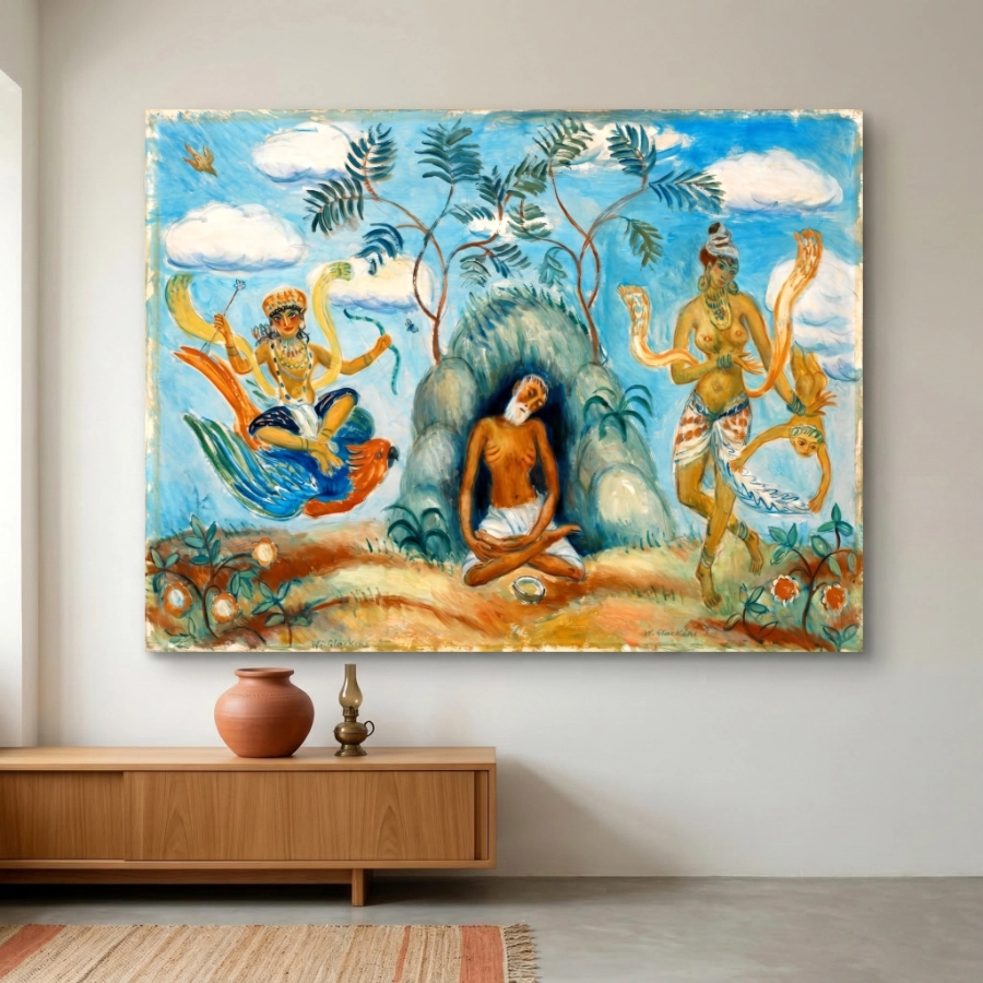 They called him the American Renoir — which was meant as a compliment but perhaps undersold him. Glackens spent his career painting the joy of everyday life with a colour sense so instinctive it looked effortless. But here he turned that same luminous, sun-warmed palette toward something altogether different — the gods, the sages, the ancient stories of a civilization he had only encountered through imagination. The result is mythological painting without the stiffness of academic tradition: Durga flies, the ascetic sits unmoved, the apsara dances, and all of it breathes with the same loose, alive energy Glackens brought to a Paris café or a New York park.