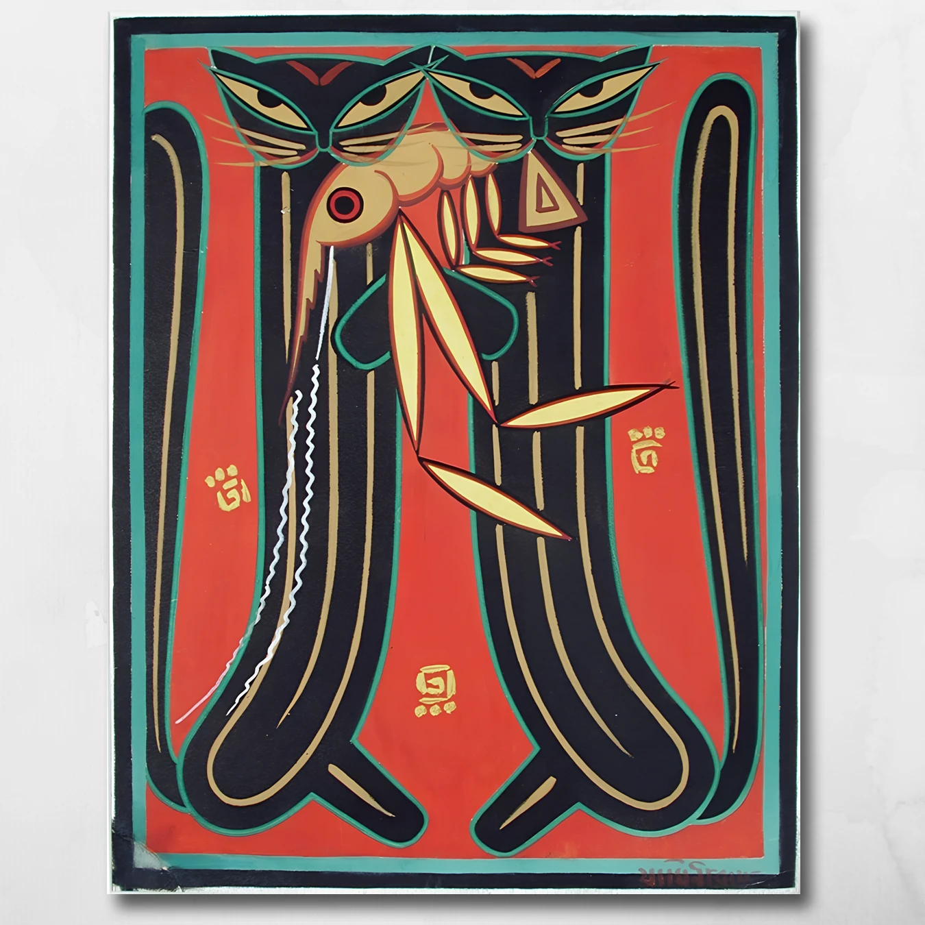 Jamini Roy walked away from European academic painting at the height of his career and never looked back. He turned instead to the folk traditions of Bengal — the flat lines, the bold outlines, the colours that don’t apologise — and built a visual language so original it became iconic. But Roy also had a sly sense of humour that art historians tend to underplay. These two cats aren’t a symbol or an allegory. They’re just cats, intensely focused on the most important thing in the room. Every cat owner knows that look. On large-format museum-grade canvas, Roy’s graphic power goes full volume — bold, joyful, and completely alive.