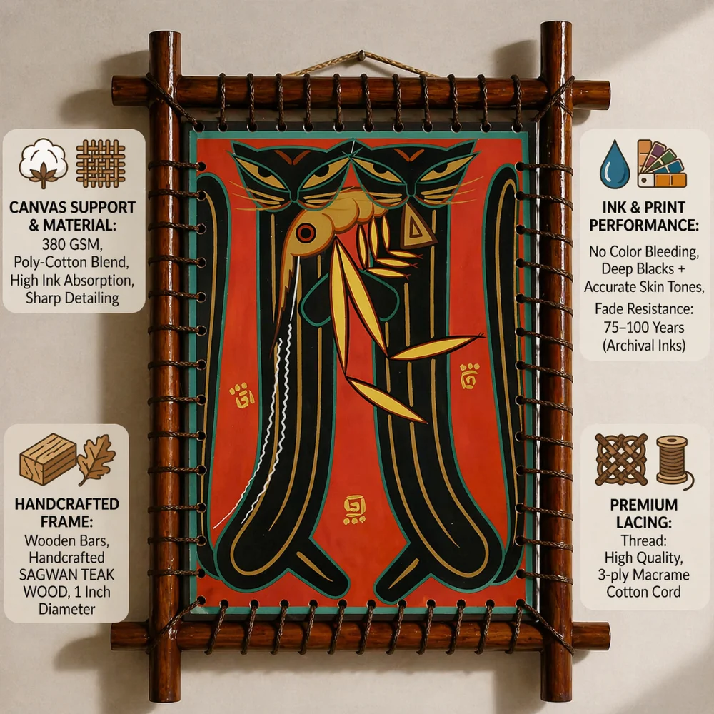 Presented as a floating canvas installation, the artwork is tension-mounted on solid Sagwan teak, creating a clean, modern structure designed for contemporary walls.