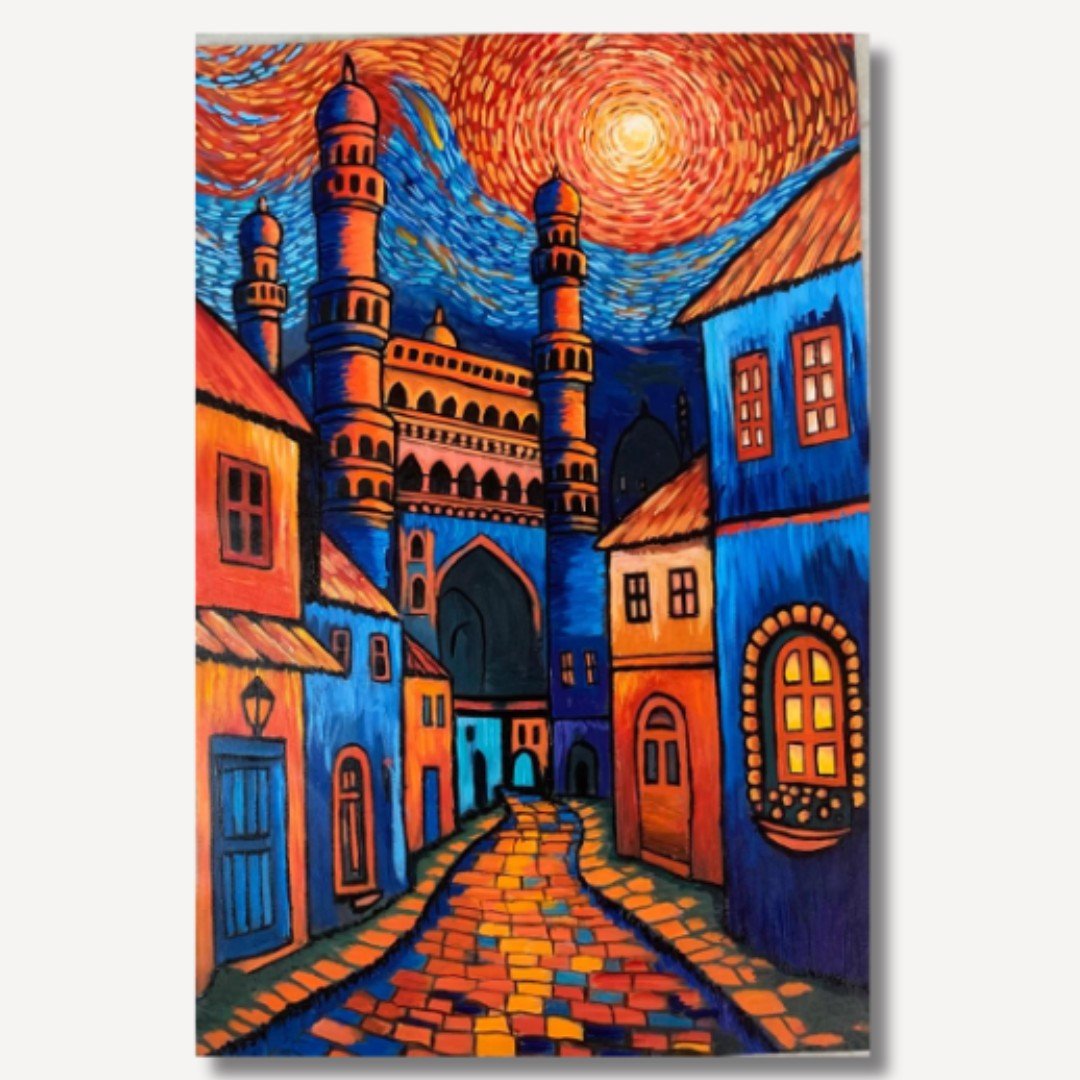This work merges Van Gogh’s swirling skies and Alfemov’s radiant colours with the architectural soul of Hyderabad’s Charminar and European Architecture of houses and lane around that.