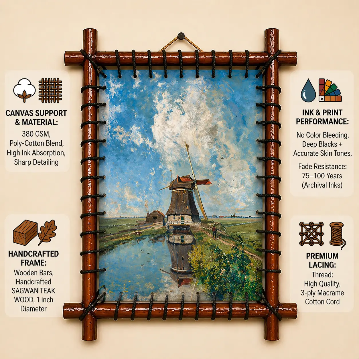 The canvas is tension-mounted onto a solid Sagwan teak structure, creating a clean, floating presentation for modern walls.
