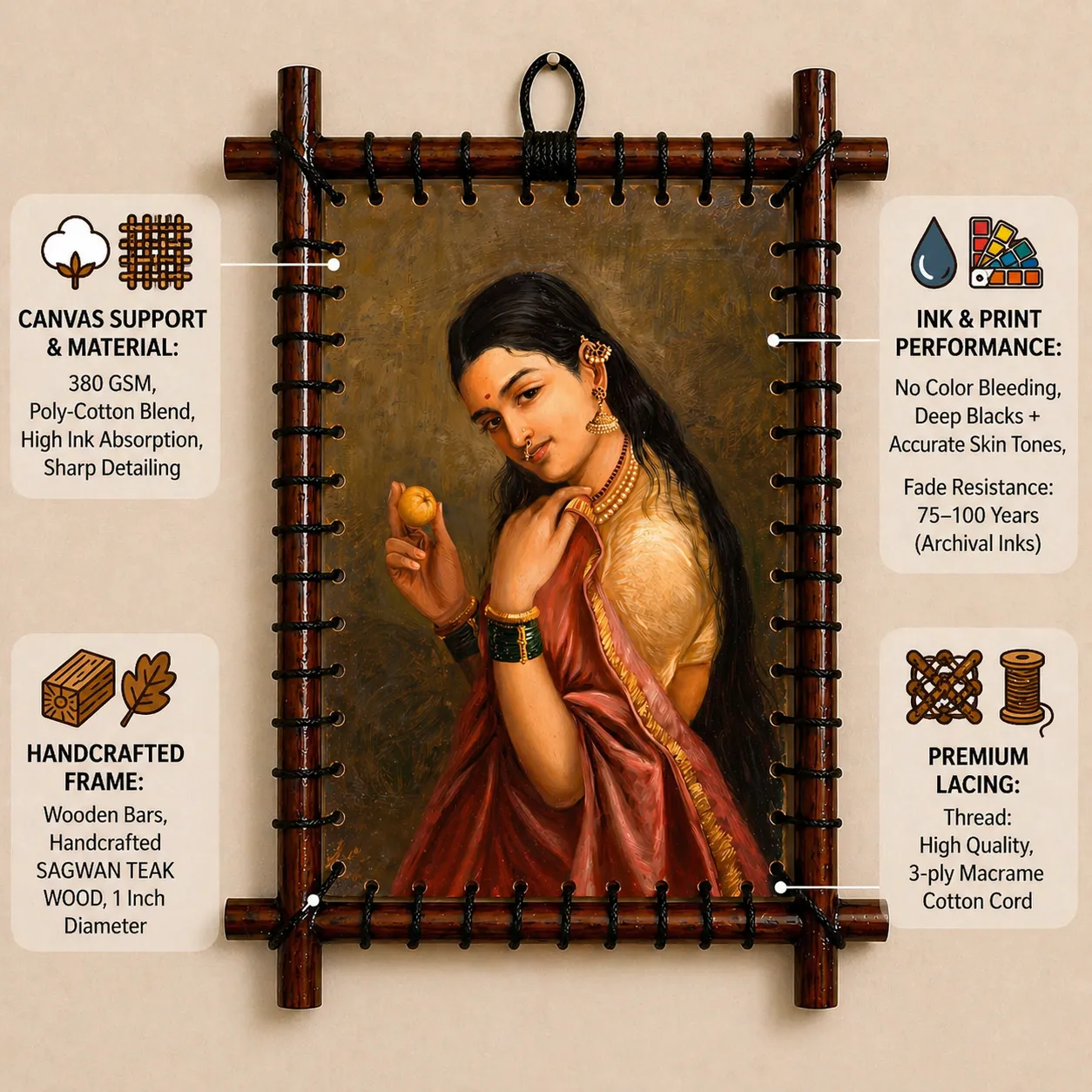 Presented as a BAC canvas installation, the artwork is tension-mounted on solid Sagwan teak. No glass. No outer frame — just a clean, handcrafted structure that lets the work stand on its own.